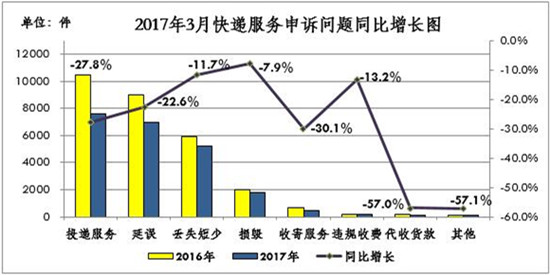 2017年3月,消費(fèi)者對(duì)快遞服務(wù)申訴的主要問題與上月比較增長(zhǎng)的有損毀、違規(guī)收費(fèi)、丟失短少,環(huán)比增長(zhǎng)23.9%、20.6%、13.3%。與去年同期相比,快遞服務(wù)的主要問題均有所下降。申訴比較集中的問題是投遞服務(wù)和延誤,占比分別為33.9%和31.2%。