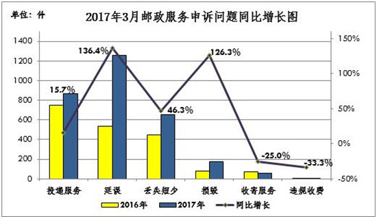 2017年3月,消費(fèi)者對(duì)郵政服務(wù)申訴的主要問題與上月相比增長(zhǎng)的有郵件丟失短少和郵件損毀,分別增長(zhǎng)77.7%和42.1%。與去年同期相比,郵政服務(wù)的主要問題增長(zhǎng)的有郵件延誤、郵件損毀、郵件丟失短少和投遞服務(wù)。其中增長(zhǎng)幅度較大的有郵件延誤和郵件損毀,同比分別增長(zhǎng)136.4%和126.3%。