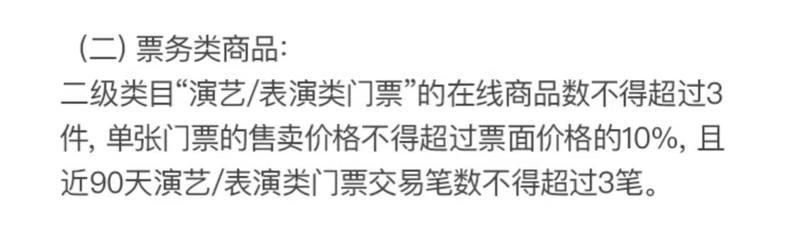 經(jīng)過查閱閑魚社區(qū)公約,發(fā)現(xiàn)其對票務(wù)類商品僅規(guī)定了“二級類目‘演藝/表演類門票’的在線商品數(shù)不得超過3件,單張門票的售賣價(jià)格不得超過票面價(jià)格的10%。”對于其他票務(wù)類型并沒有做出明確的規(guī)定。經(jīng)咨詢,閑魚客服對此類行為做出回應(yīng):“如果被系統(tǒng)審核為風(fēng)險(xiǎn)商品是會進(jìn)行下架的。”