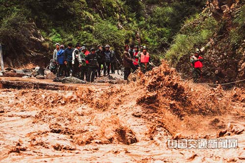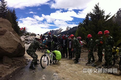 2013年5月,武警交通二支隊官兵正在幫助騎行愛好者通過水毀路段。汪巍 攝影