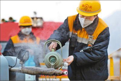 安陽綜合段作業(yè)人員用熱水一點(diǎn)點(diǎn)融化水槍噴頭上的冰。鮑鑫 祝慶/攝影