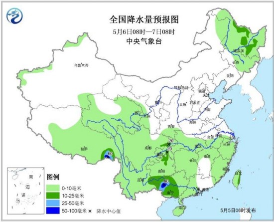 全國降水量預(yù)報(bào)圖(5日08時(shí)-6日08時(shí))
