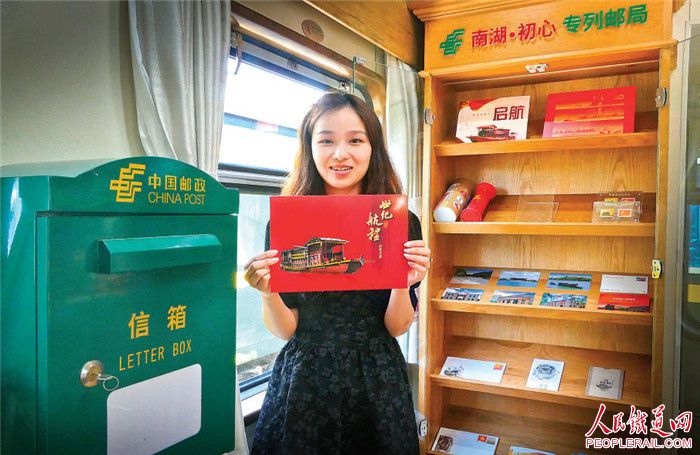 旅客展示車廂內(nèi)的“南湖·初心”列車郵局和紅色書籍讀書角。吳少妮/圖