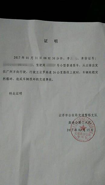 云浮市公安局交通警察支隊的證明中,顯然是車輛輪轂突然爆碎,才造成車輛損壞。